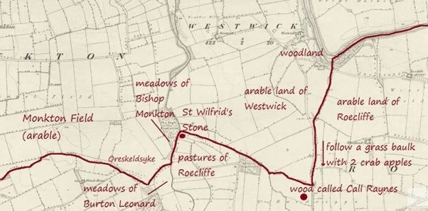 The procession began at Brampton Thorn on the north bank of the River Ure, on the boundary between the townships of Brampton and Mulwith. It headed upstream and across the river, through woodland then along a baulk (grassy ridge) dividing the arable fields of Roecliffe from those of Westwick. Landmark trees were useful features to record, so it was noted that two crab apples grew on the baulk. Passing by another wood (no longer present) called Le Call Raynes, the boundary followed ditches as far as the Holbeck “and to a great stone on its bank commonly called St Wilfird’s Stone”. From there, the route followed the beck between meadows belonging to Bishop Monkton on one side and Burton Leonard on the other, then between Burton Leonard Moor and Monkton Field.