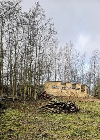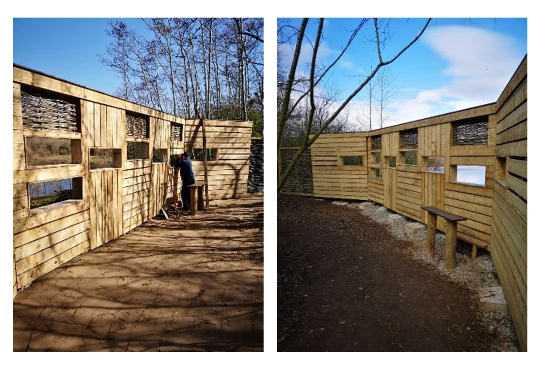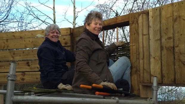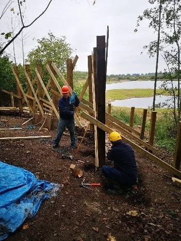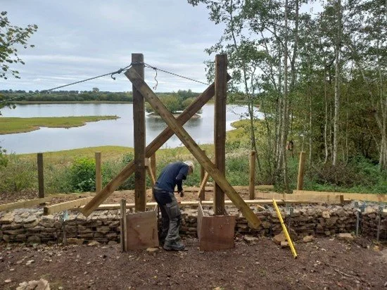 The project has involved building a substantial timber screen, installing woven willow panels crafted from coppiced willow grown on site, laying gravel foundations and erecting new fencing. The finished structure provides an elevated, sheltered viewpoint and will be fully wheelchair accessible, with future plans to upgrade the approach path.